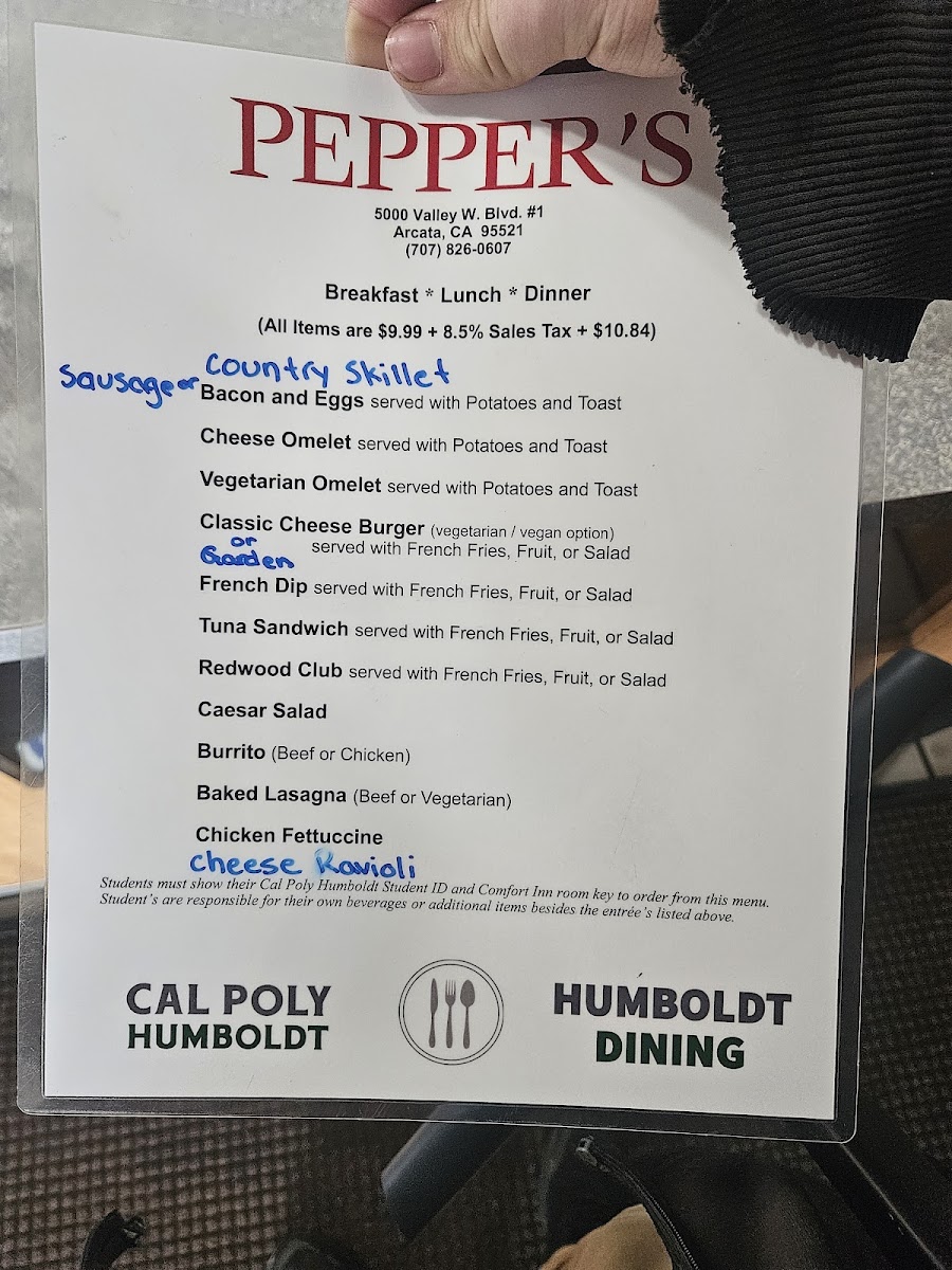 As a final takeaway, the menu at Peppers Arcata, located at 5000 Valley W Blvd, Arcata, CA 95521, United States, stands out for its impressive breadth and classic American comfort appeal, offering something satisfying for nearly every appetite. From indulgent desserts like Hot Apple Pie, Fruit Pie, Double Fudge Cake, Carrot Cake, and Cheesecake, to hearty Side Orders such as 4 Strips Bacon, 4 Link Sausages, Ham Steak, and Large Fresh Eggs, the menu feels both familiar and generously portioned. The Anytime Specialties-including Steamed Broccoli Loaded Potato, Chili Loaded Potato, Hearty Soup, Quesadillas- Beef Or Chicken, and Enchiladas Supreme With Fresh Avocado-highlight the kitchen’s comfort-first philosophy, while Signature Entrées like New York Steak & Shrimp, New York Steak & Fettuccine, Steak Marsala, New York Steak & Scampi, and New York Strip Steak reinforce the restaurant’s steakhouse-style confidence. Sandwich lovers are well covered with Chicken Breast Sandwiches such as Chicken Wrap, Chicken Cordon Bleu, Redwood Club, Garlic Chicken Cheesesteak, and Chicken Strips Sandwich, alongside Superb Sandwiches like Breast Of Turkey, Grilled Cheese & Tomato Sandwich, Grilled Turkey, Bacon & Cheese, French Dip, and Pepper's Style Club. Lighter options appear in Fresh Salads including Chinese Chicken Salad, Salad Bowl, Caesar Salad, Chef Salad, and Fiesta Salad, while starters like The Sampler, Chicken Strips Basket, Seasoned Curly Fries, Super Nachos, and the crowd-pleasing Wings, Wings, Wings set the tone for casual dining. Breakfast and brunch truly shine with Sweet Crepes such as Nutella Sweet Crepes (No Potato) and Whipped Cream Cheese Crepes, Savory Crepes like Mushroom Crepes, Ham & Cheese Crepes, and Chicken & Mushroom Crepes, plus griddle favorites including Waffle Special, Crispy Strawberries 'N Cream Waffle, Two By Three, Cinnamon French Toast, and Cinnamon French Toast Special. Add in Breakfast Specialties, Skillets, Benedicts, Three Egg Omelettes, Burgers, full Chicken Entrées, Seafood Entrées, thoughtful Vegetarian dishes, and classic Beverage options, and the menu ultimately feels like a well-rounded, all-day destination-reliable, comforting, and designed to please a wide range of tastes in one welcoming setting.